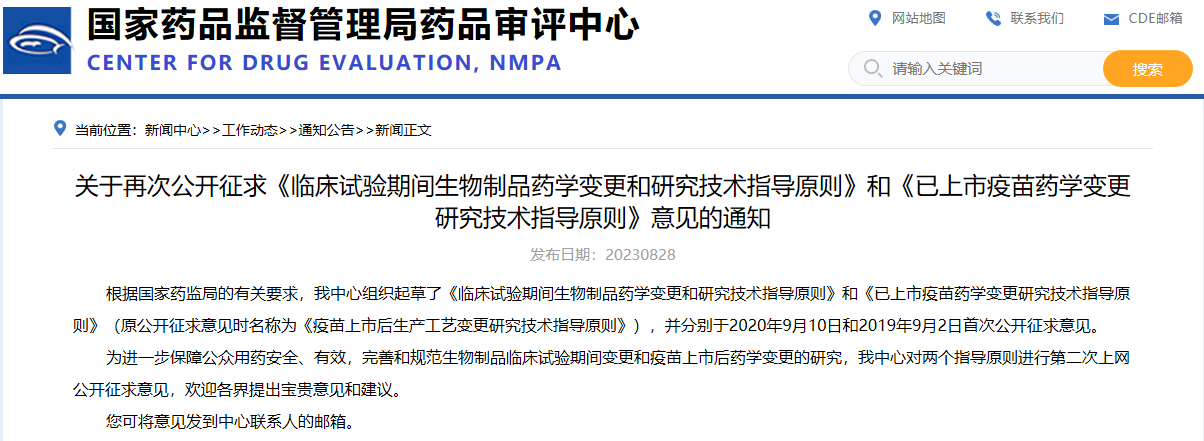 關于再次公開征求《臨床試驗期間生物制品藥學變更和研究技術指導原則》和《已上市疫苗藥學變更研究技術指導原則》意見的通知