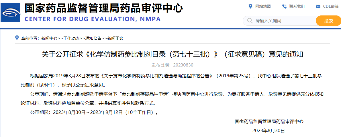 關于公開征求《化學仿制藥參比制劑目錄(第七十三批)》(征求意見稿)意見的通知