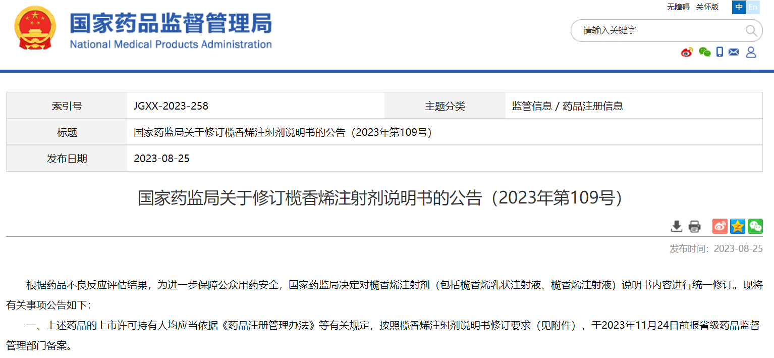 國家藥監局關于修訂欖香烯注射劑說明書的公告(2023年第109號)