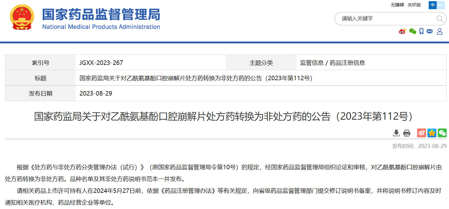 國家藥監局關于對乙酰氨基酚口腔崩解片處方藥轉換為非處方藥的公告(2023年第112號)