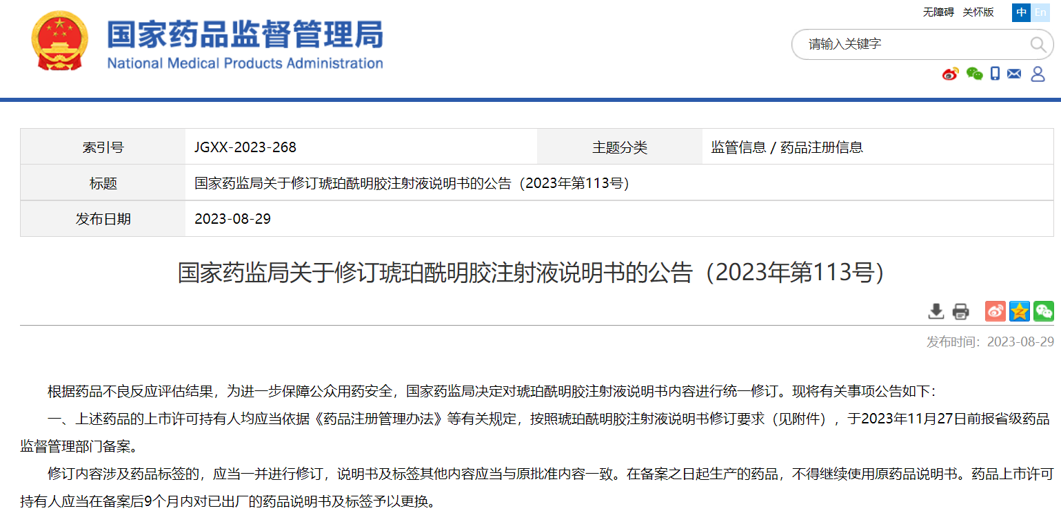 國家藥監局關于修訂琥珀酰明膠注射液說明書的公告(2023年第113號)