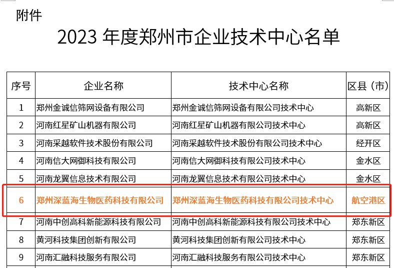 近日,鄭州市工業和信息化局公示了2023年度鄭州市企業技術中心名單,新領先·深藍海(鄭州)成功入選,這是繼獲評“高新技術企業”、“河南省專精特新中小企業”、“鄭州市專精特新中小企業”、“鄭州市MAH平臺及液體制劑工程研究中心”等榮譽后的又一項榮譽。