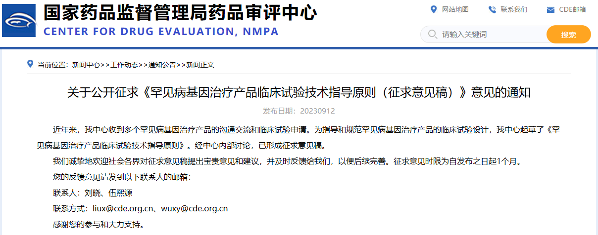 關于公開征求《罕見病基因治療產品臨床試驗技術指導原則(征求意見稿)》意見的通知