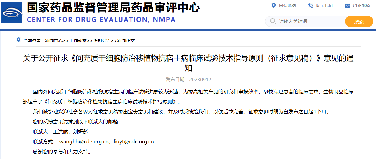 關于公開征求《間充質干細胞防治移植物抗宿主病臨床試驗技術指導原則(征求意見稿)》意見的通知