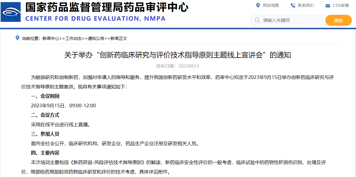 關于舉辦“創新藥臨床研究與評價技術指導原則主題線上宣講會”的通知