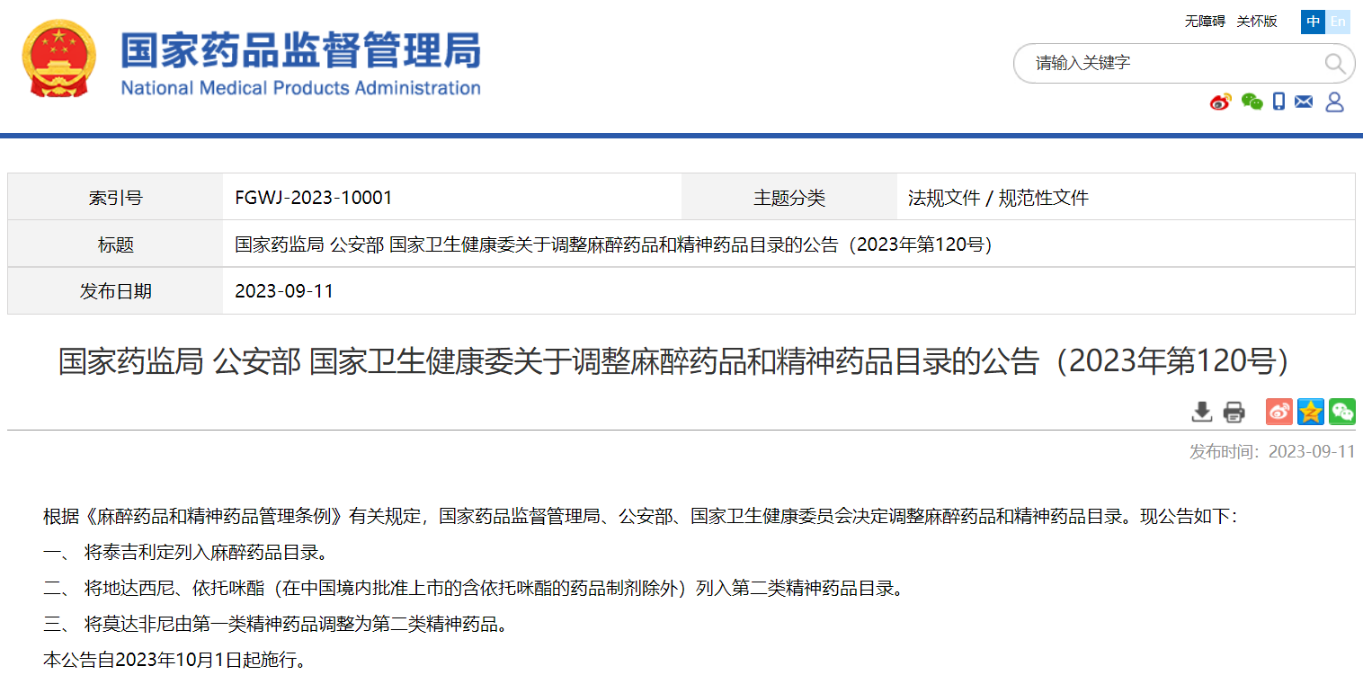 國家藥監局 公安部 國家衛生健康委關于調整麻醉藥品和精神藥品目錄的公告(2023年第120號)