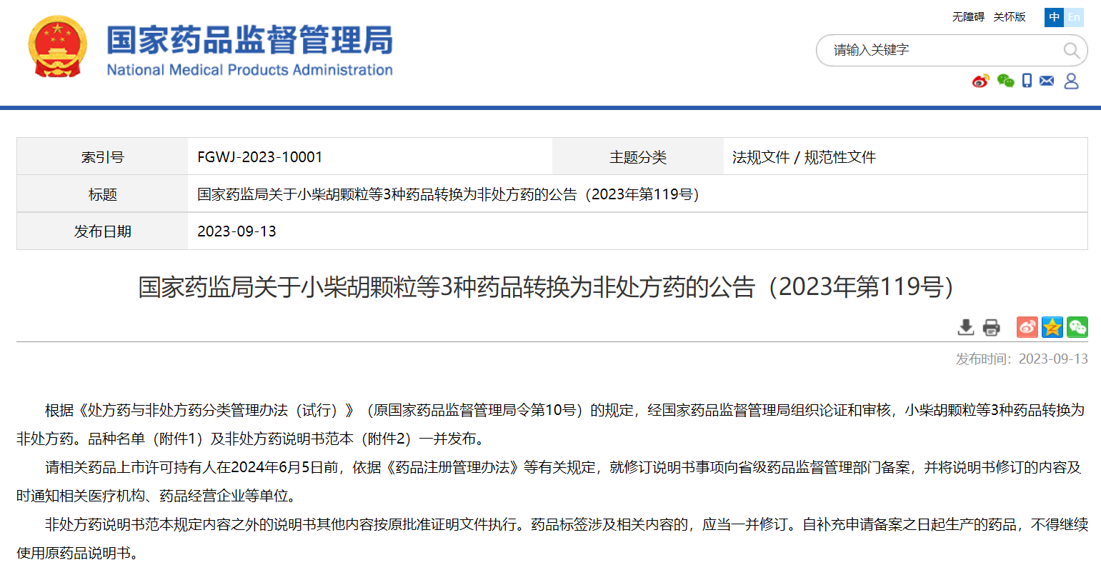 國家藥監局關于小柴胡顆粒等3種藥品轉換為非處方藥的公告(2023年第119號)