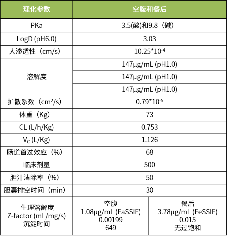 甲苯咪唑是一種口服藥物,具有中等親脂性,該化合物具有很強的pH依賴性,在酸性環境(pH 1.0)中溶解度為147μg/mL,在中性環境(pH 7.0)中溶解度為0.67 μg/mL,在堿性環境(pH 12.5)中溶解度為187 μg/mL,在空腹狀態模擬腸液中測定的溶解度為1.08 mg/mL,在餐后狀態模擬腸液中測定的溶解度為3.78 mg/mL,該化合物的滲透率估計很高(Human Peff 10.25*10 ^4cm/s)導致BCS II分類,溶出模型選擇Z-factor模型。