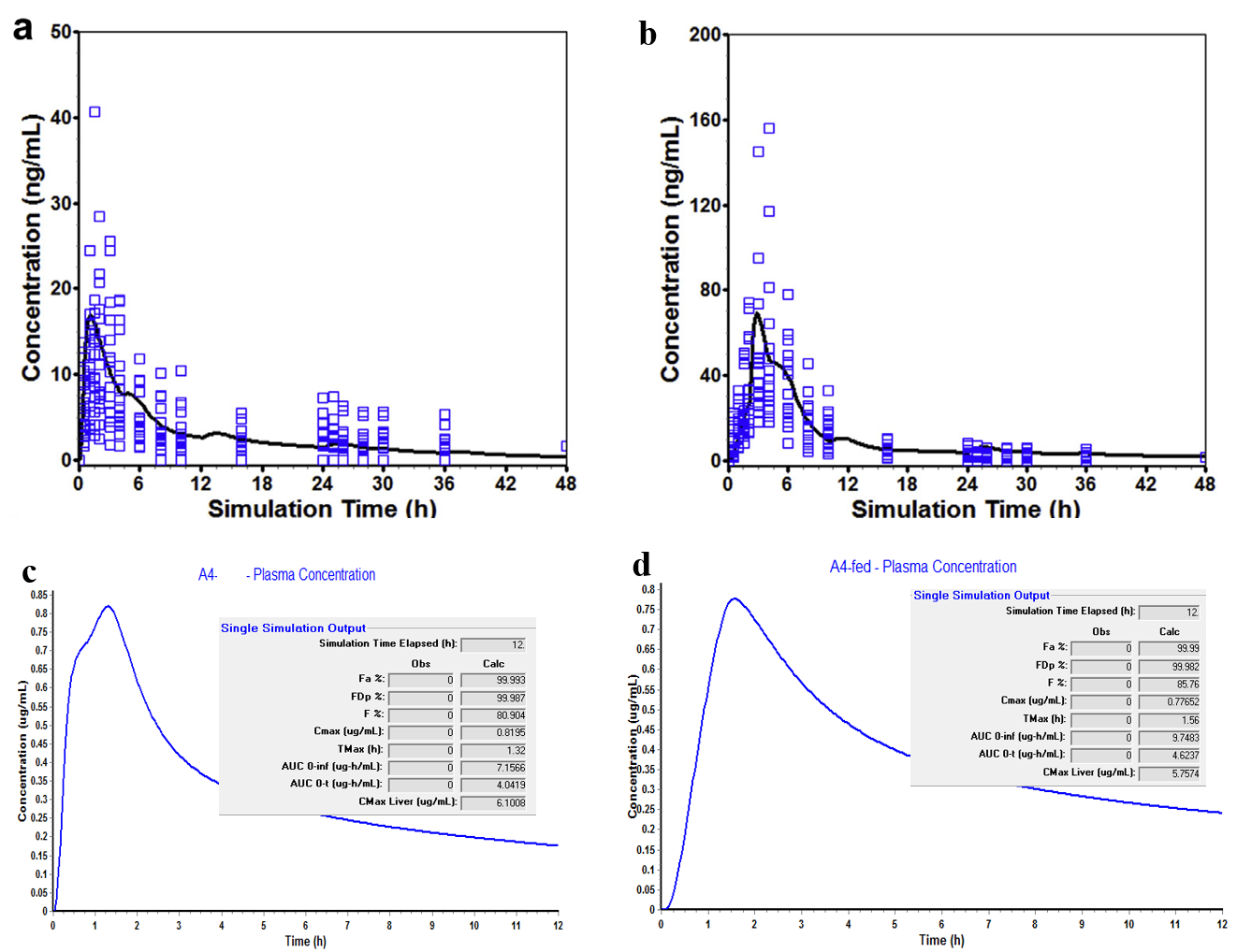 說明:a和b參考文獻中案例2軟件模擬和預測值,c和d是小編建模模擬值,分析由于數據信息欠缺與文獻值有差異,但是小編模擬結果也表明化合物2表現出明顯的正向食物效應。