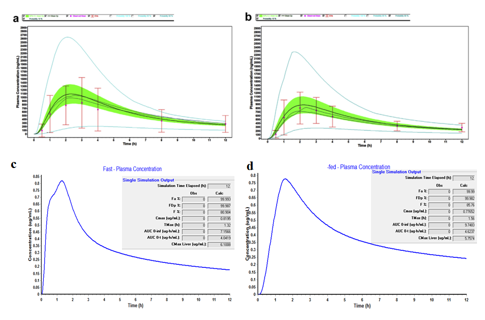 說明:a和b是參考文獻中案例4的軟件模擬和預測值,c和d是小編建模模擬值,小編在模擬過程中發現針對BCSII類弱堿性化合物,溶出模型選擇Johnson模型時,pH對應溶解度對模擬結果影響很大,小編輸入pH1對應溶解度與結果擬合較好,為了與文獻值相似,小編也同文獻將腸液體積從GastroPlus™的默認值進行調整,Cmax模擬結果與文獻相似。