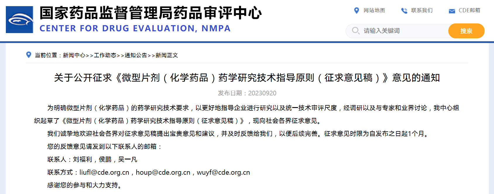 關于公開征求《微型片劑(化學藥品)藥學研究技術指導原則》(征求意見稿)意見的通知