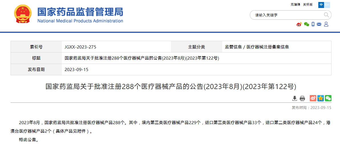 國家藥監局關于批準注冊288個醫療器械產品的公告(2023年8月)(2023年第122號)