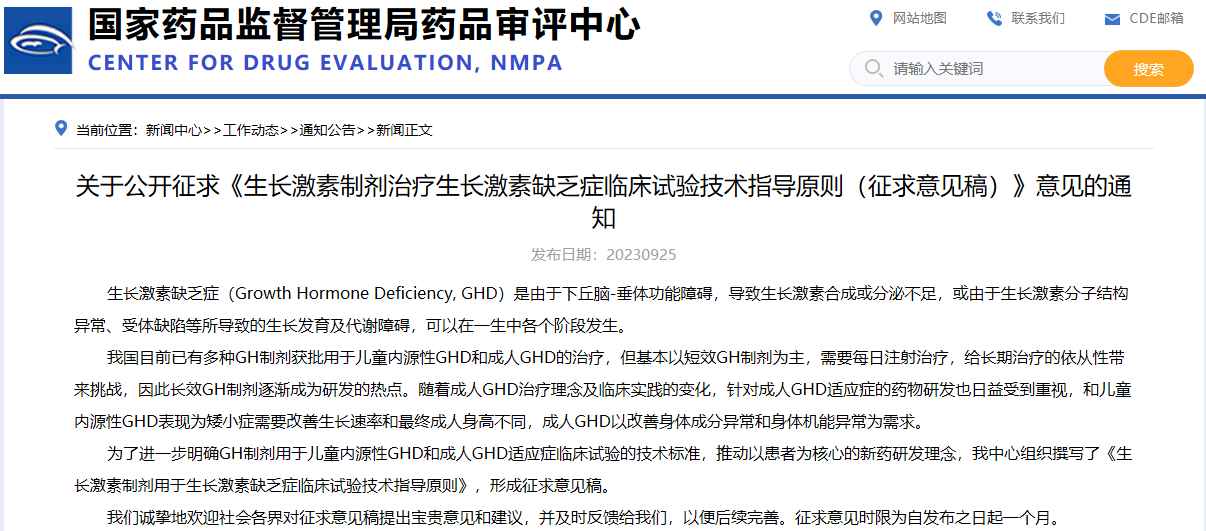 關于公開征求《生長激素制劑治療生長激素缺乏癥臨床試驗技術指導原則(征求意見稿)》意見的通知