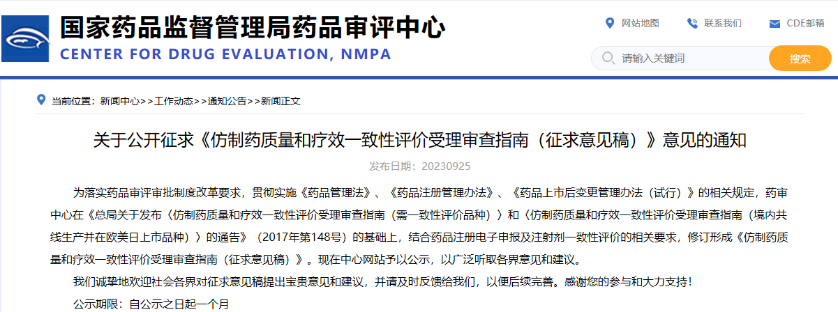 關于公開征求《仿制藥質量和療效一致性評價受理審查指南(征求意見稿)》意見的通知