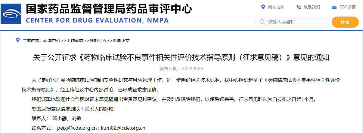 關于公開征求《藥物臨床試驗不良事件相關性評價技術指導原則(征求意見稿)》意見的通知