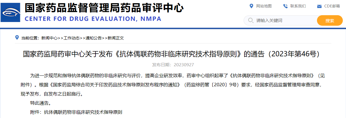 國家藥監局藥審中心關于發布《抗體偶聯藥物非臨床研究技術指導原則》的通告(2023年第46號)