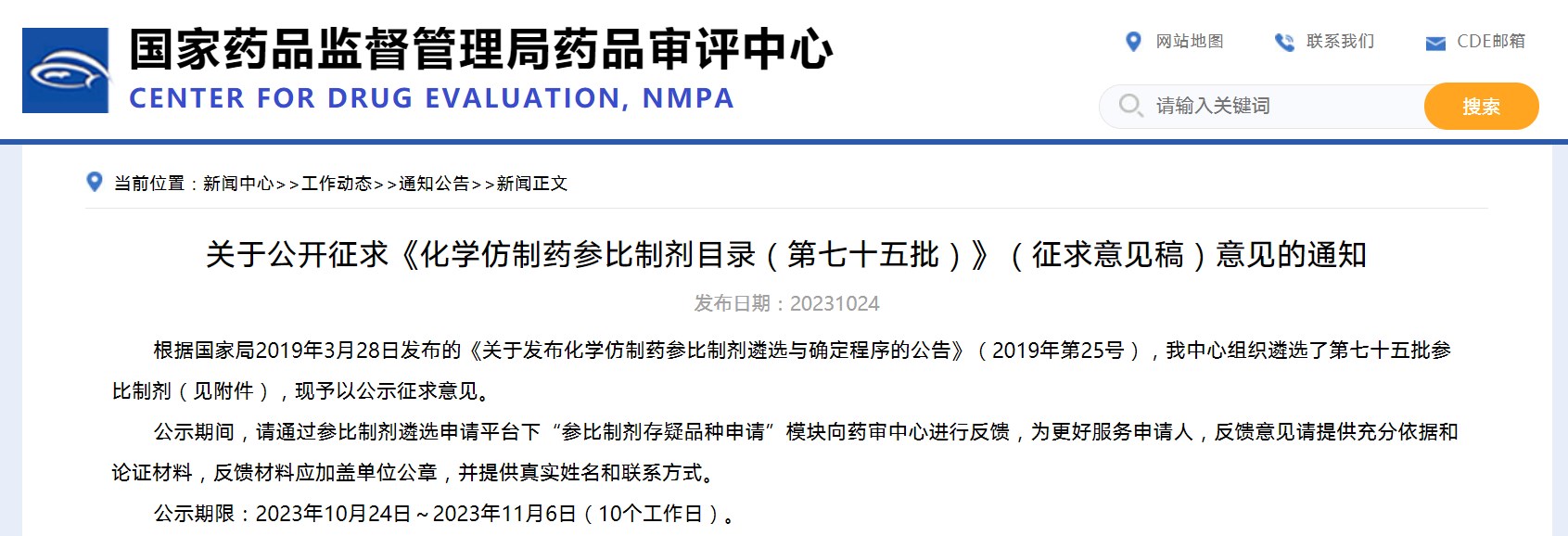 關(guān)于公開(kāi)征求《化學(xué)仿制藥參比制劑目錄(第七十五批)》(征求意見(jiàn)稿)意見(jiàn)的通知