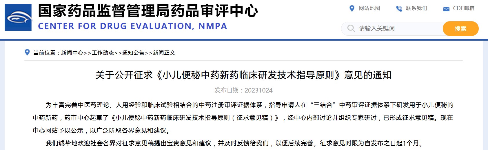 關(guān)于公開(kāi)征求《小兒便秘中藥新藥臨床研發(fā)技術(shù)指導(dǎo)原則》意見(jiàn)的通知