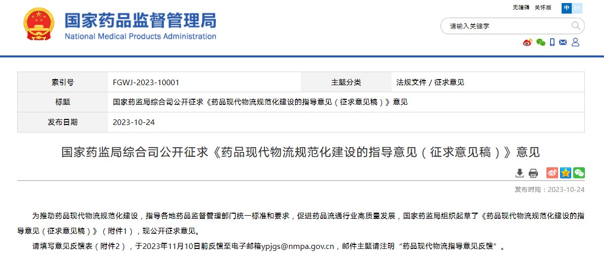 國(guó)家藥監(jiān)局綜合司公開(kāi)征求《藥品現(xiàn)代物流規(guī)范化建設(shè)的指導(dǎo)意見(jiàn)(征求意見(jiàn)稿)》意見(jiàn)