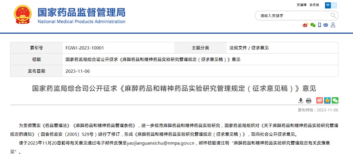政策法規 || 《麻醉藥品和精神藥品實驗研究管理規定(征求意見稿)》(附法規概覽11.06-11.10)