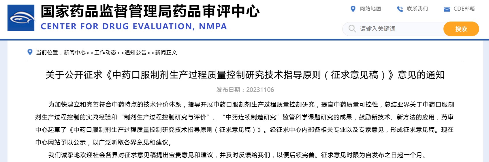 關于公開征求《中藥口服制劑生產過程質量控制研究技術指導原則(征求意見稿)》意見的通知
