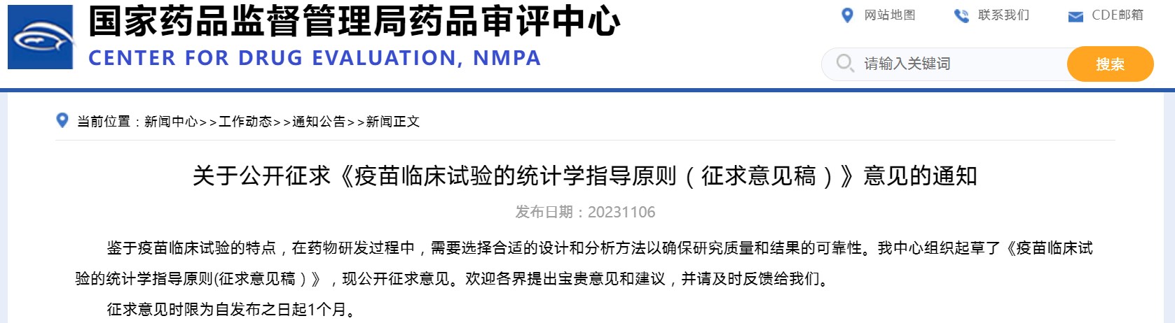 關于公開征求《疫苗臨床試驗的統計學指導原則(征求意見稿)》意見的通知