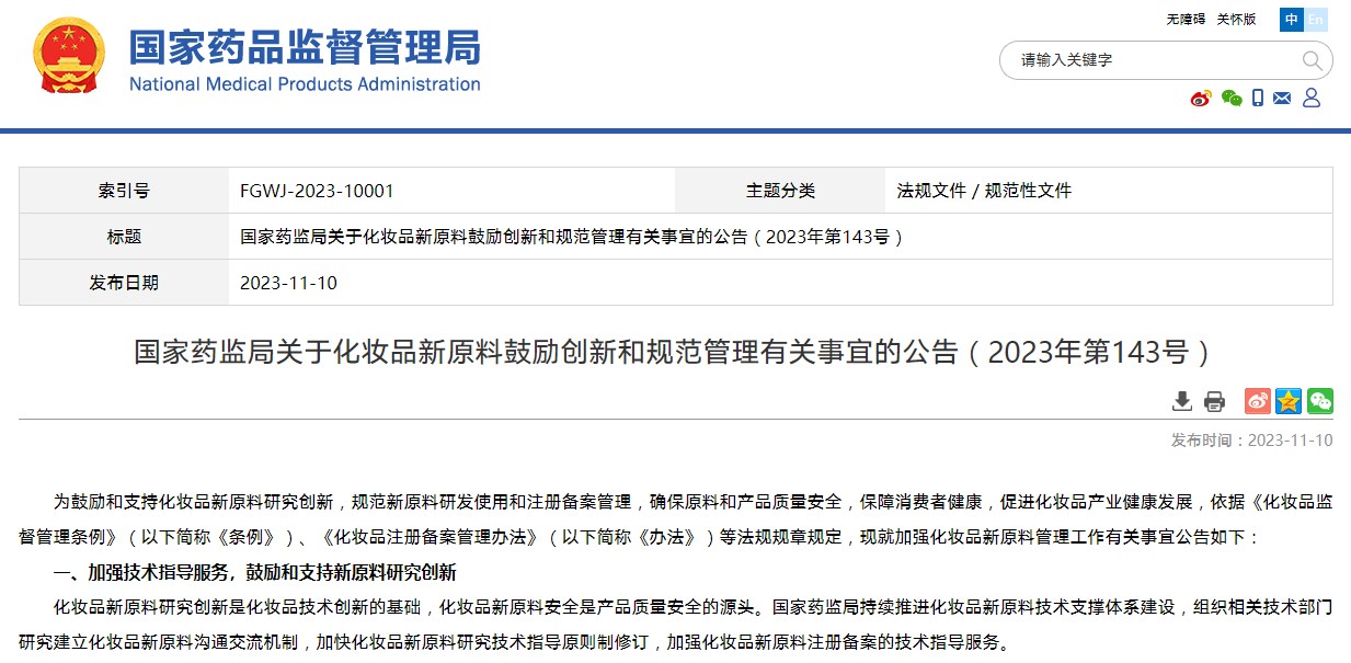 國家藥監局關于化妝品新原料鼓勵創新和規范管理有關事宜的公告(2023年第143號)