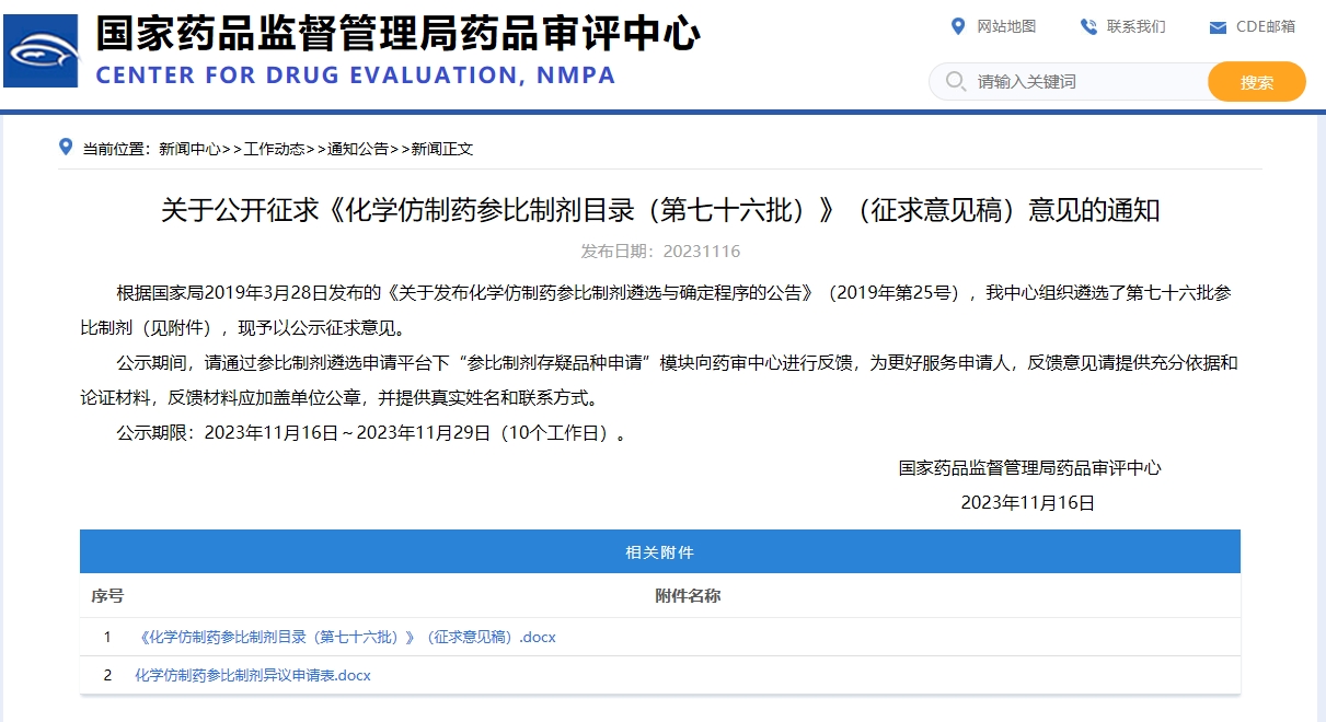 關于公開征求《化學仿制藥參比制劑目錄(第七十六批)》(征求意見稿)意見的通知