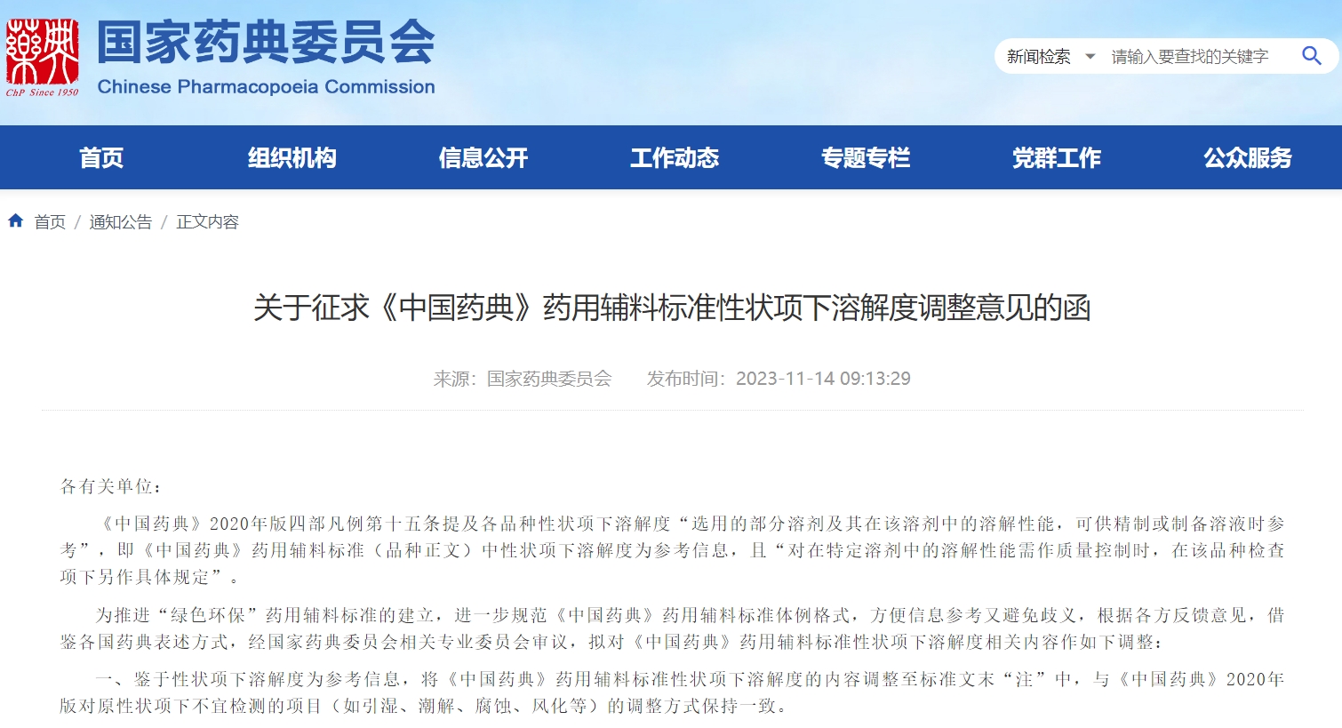 關于征求《中國藥典》藥用輔料標準性狀項下溶解度調整意見的函