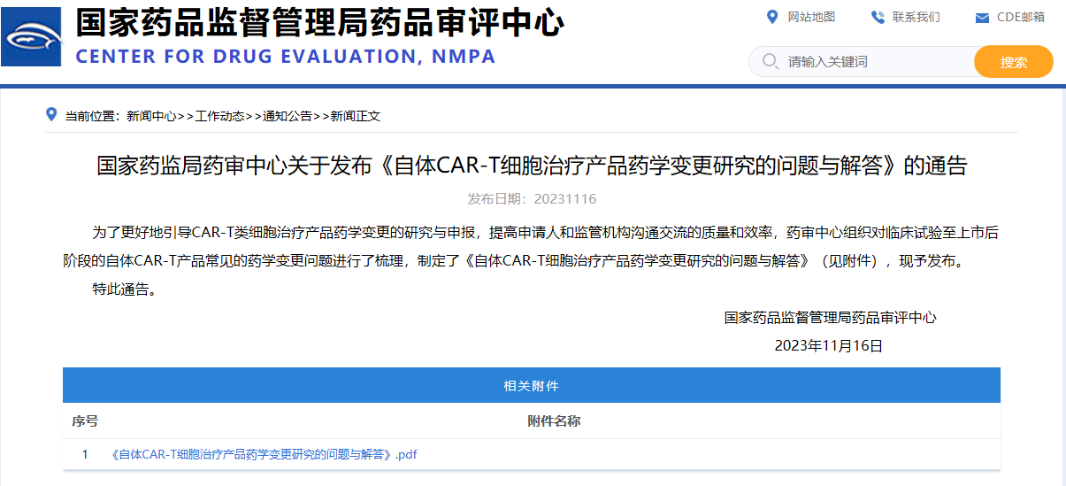 國家藥監局藥審中心關于發布《自體CAR-T細胞治療產品藥學變更研究的問題與解答》的通告