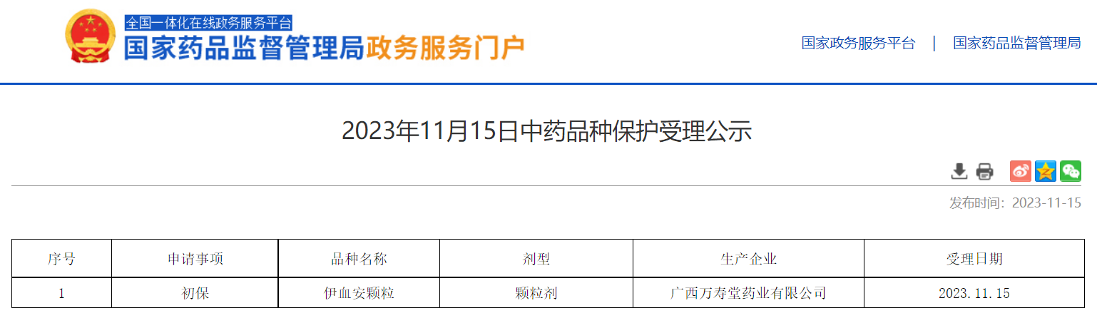2023年11月15日中藥品種保護受理公示