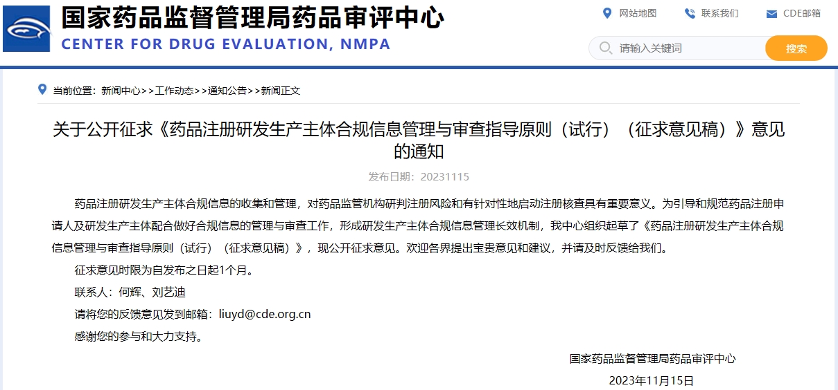 關于公開征求《藥品注冊研發生產主體合規信息管理與審查指導原則(試行)(征求意見稿)》意見的通知