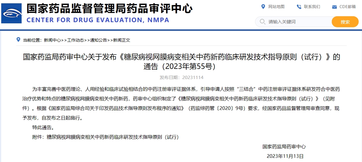 國家藥監局藥審中心關于發布《糖尿病視網膜病變相關中藥新藥臨床研發技術指導原則(試行)》的通告(2023年第55號)
