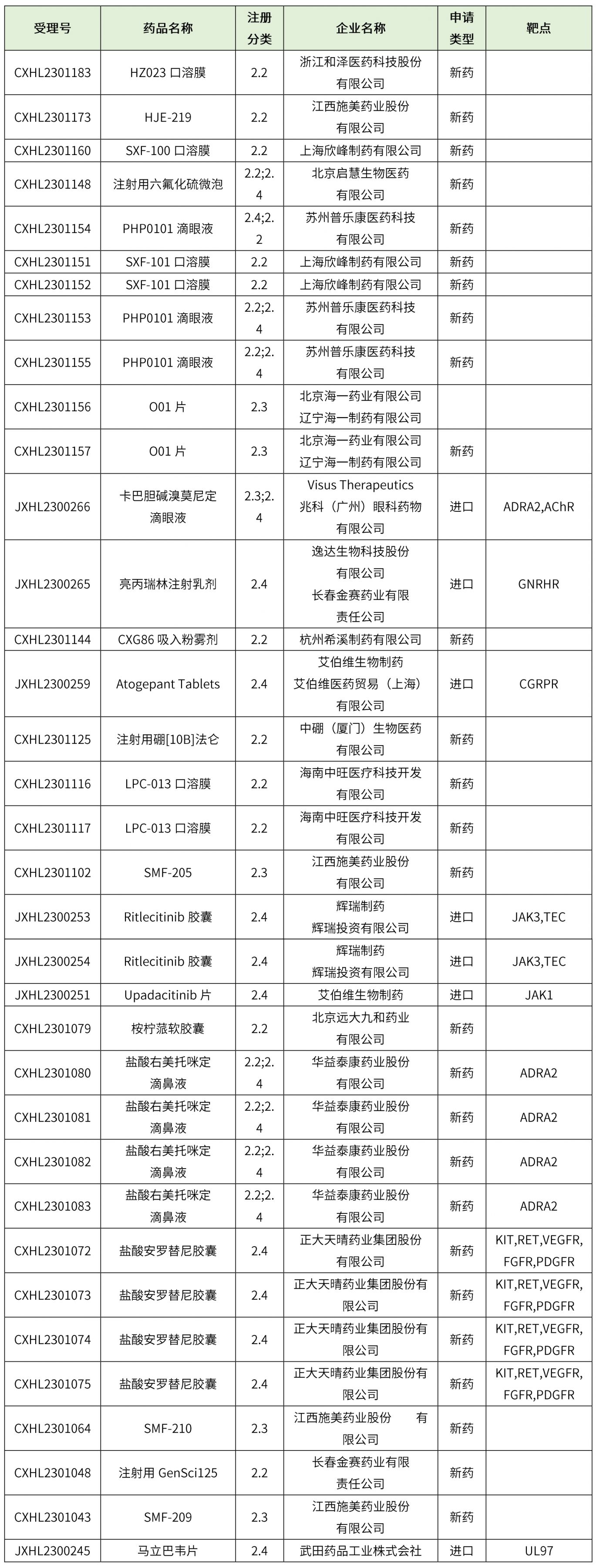① 化藥1類新藥61個(艾托莫德片、TQH3906膠囊、SIM0501片、TQG3020片、BMS-986435片、BI1015550片、TNO155膠囊、TAK-279片、LY3537982膠囊、Sisunatovir片、LOU064片、Nemtabrutinib片等),藥物詳細信息見下表。