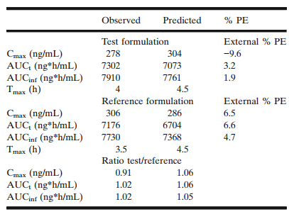 上述開發的模型用于預測仿制藥和參比制劑在餐后狀態下的平均血藥濃度,預測的Cmax和AUC均比空腹條件下偏高,原因為在體內溶出速率提高,由于胃腸道轉運時間提高及胃的流體體積增加。因藥物的溶解性不存在pH依賴性,不同的pH不影響溶出速率。