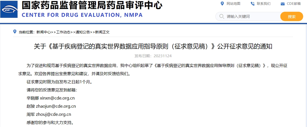 關于《基于疾病登記的真實世界數據應用指導原則(征求意見稿)》公開征求意見的通知