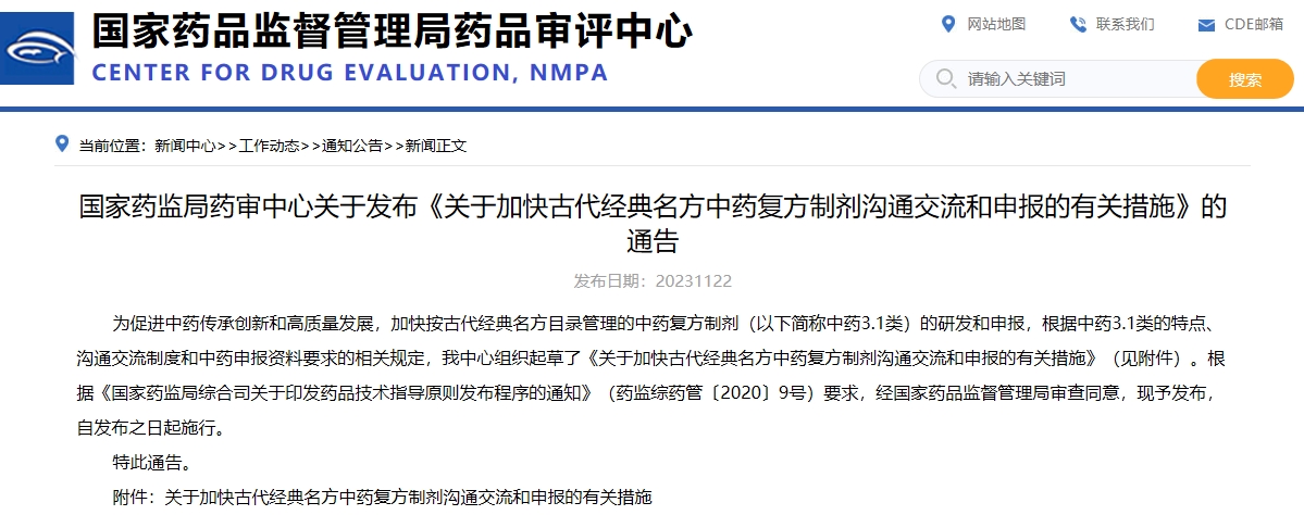 國家藥監局藥審中心關于發布《關于加快古代經典名方中藥復方制劑溝通交流和申報的有關措施》的通告