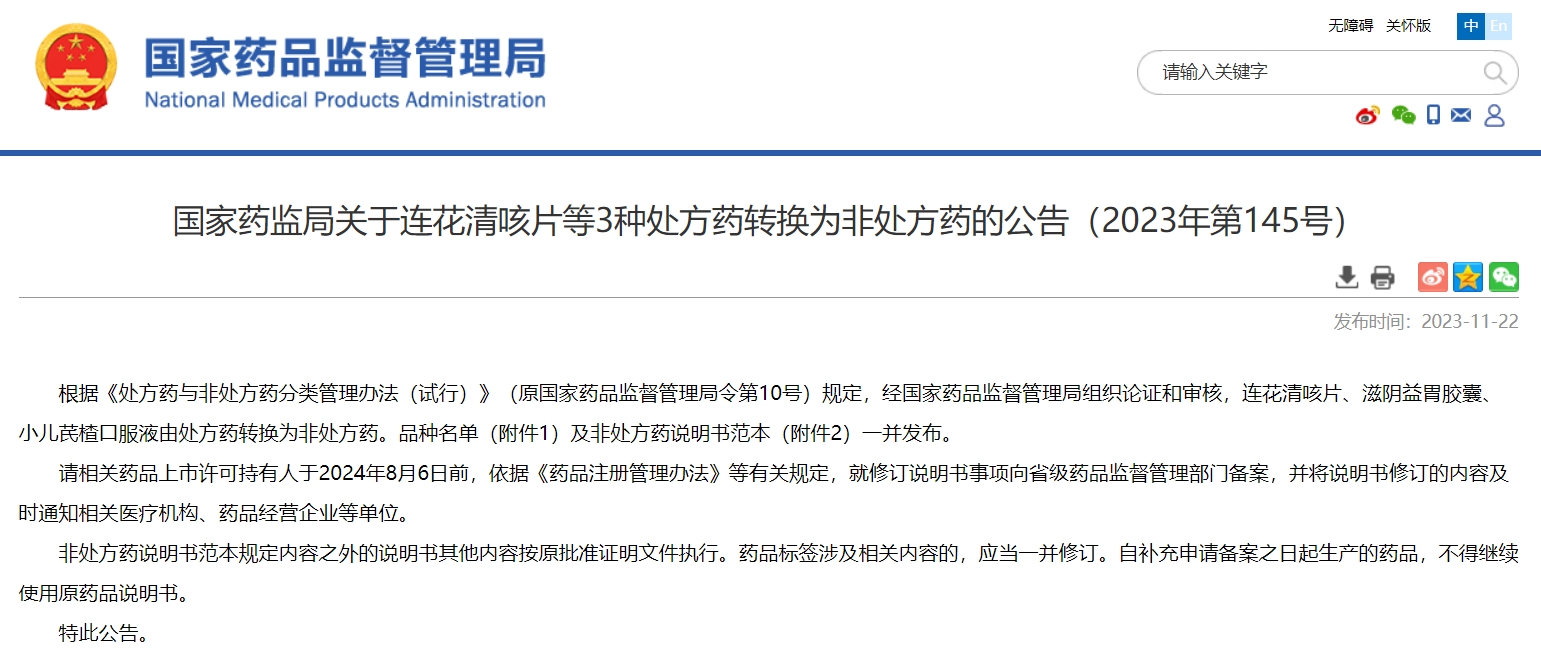國家藥監局關于連花清咳片等3種處方藥轉換為非處方藥的公告(2023年第145號)