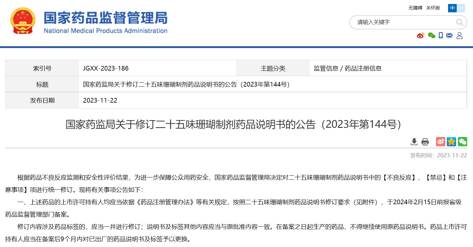 國家藥監局關于修訂二十五味珊瑚制劑藥品說明書的公告(2023年第144號)