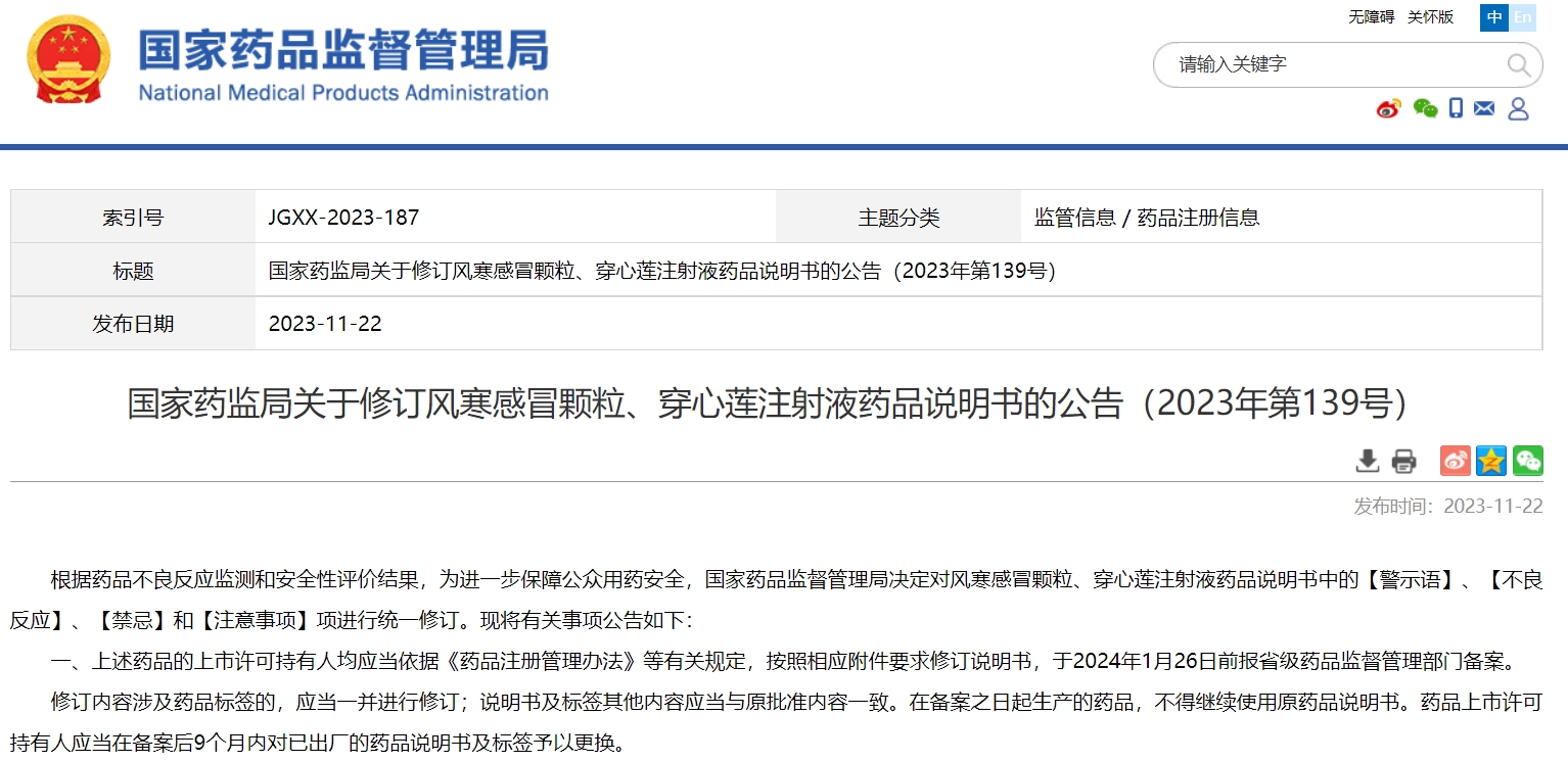 國家藥監局關于修訂風寒感冒顆粒、穿心蓮注射液藥品說明書的公告(2023年第139號)