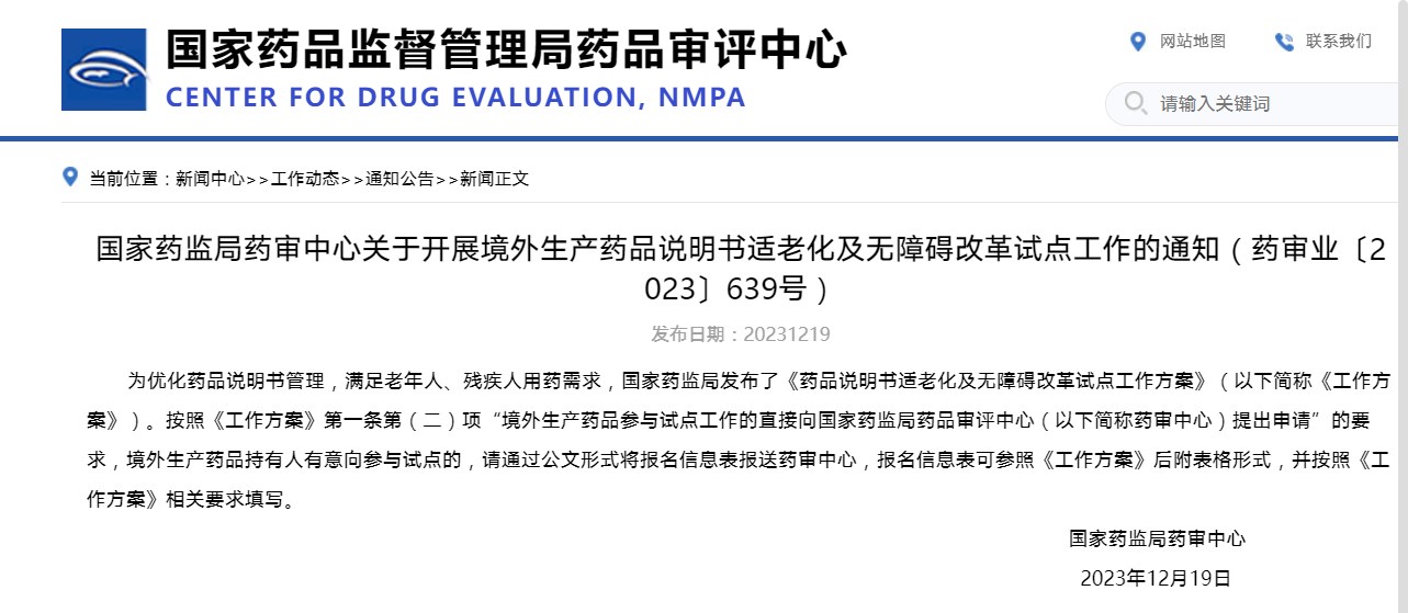 國家藥監局藥審中心關于開展境外生產藥品說明書適老化及無障礙改革試點工作的通知(藥審業〔2023〕639號)