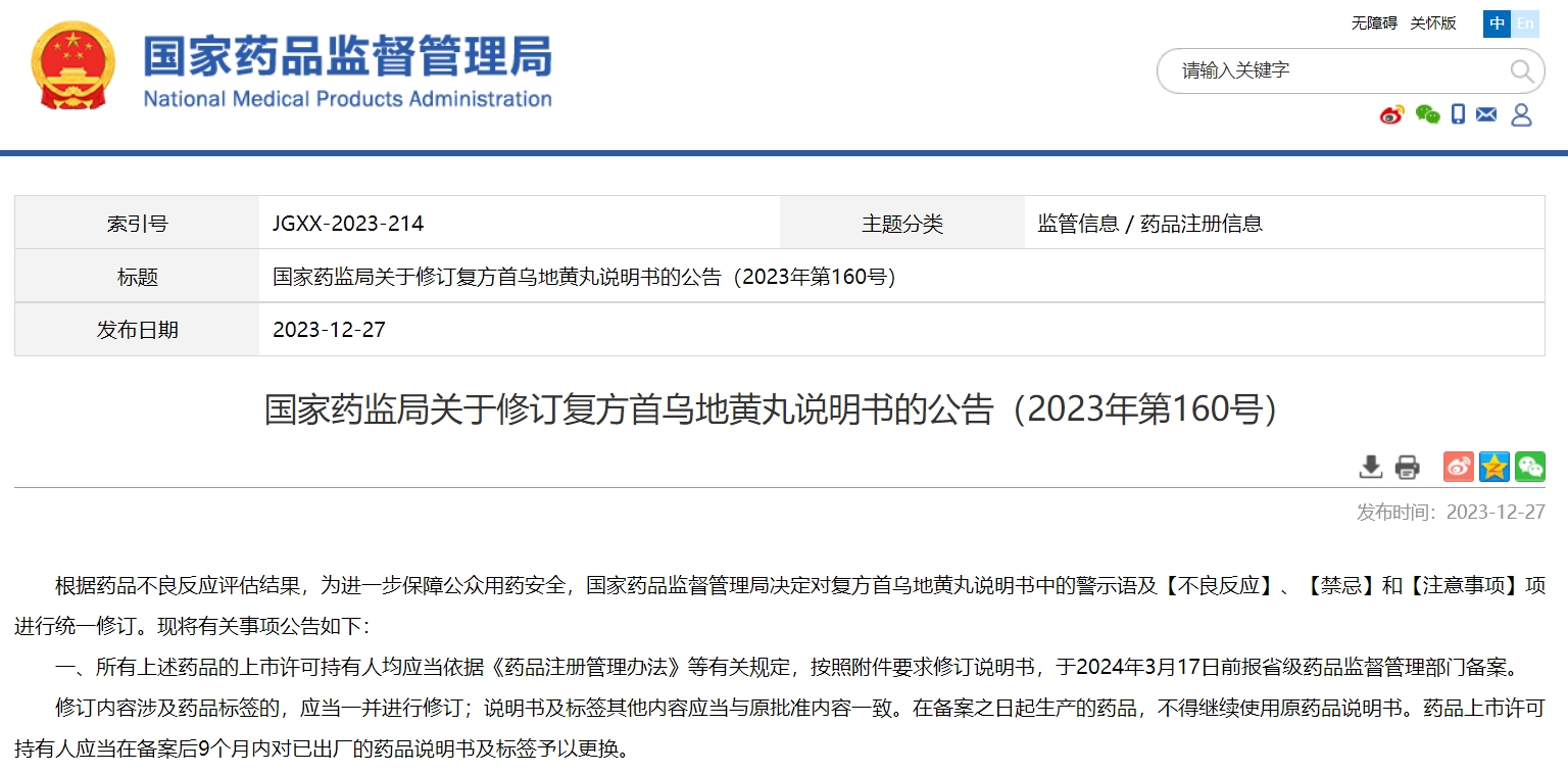 國家藥監(jiān)局關(guān)于修訂復(fù)方首烏地黃丸說明書的公告(2023年第160號)