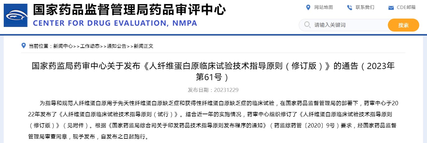 國家藥監局藥審中心關于發布《人纖維蛋白原臨床試驗技術指導原則(修訂版)》的通告(2023年第61號)