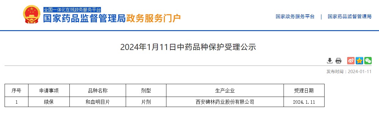 2024年1月11日中藥品種保護受理公示