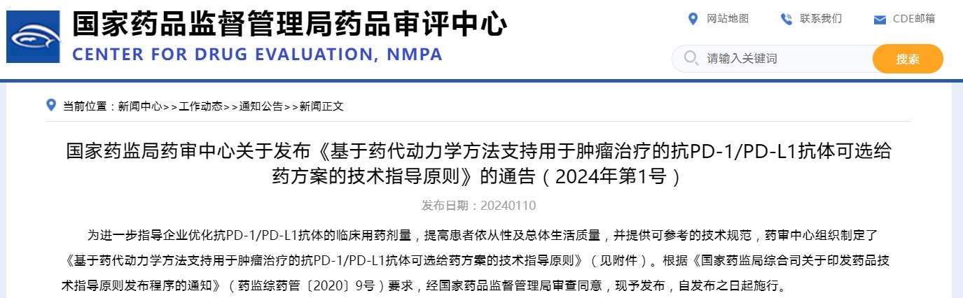 國家藥監局藥審中心關于發布《基于藥代動力學方法支持用于腫瘤治療的抗PD-1/PD-L1抗體可選給藥方案的技術指導原則》的通告(2024年第1號)