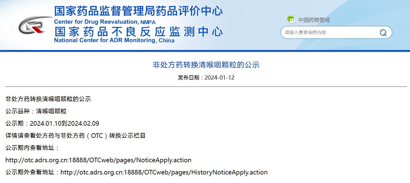 非處方藥轉換清喉咽顆粒的公示