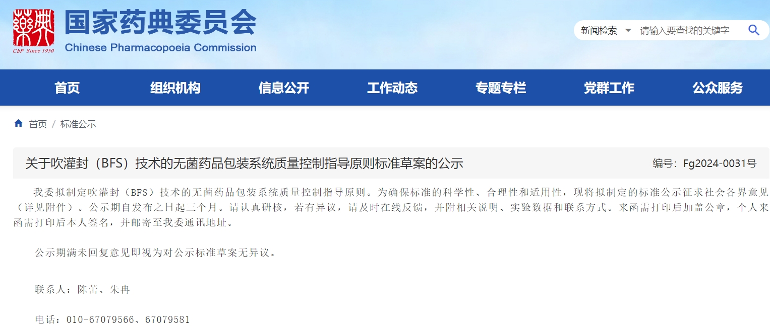 關于吹灌封(BFS)技術的無菌藥品包裝系統質量控制指導原則標準草案的公示