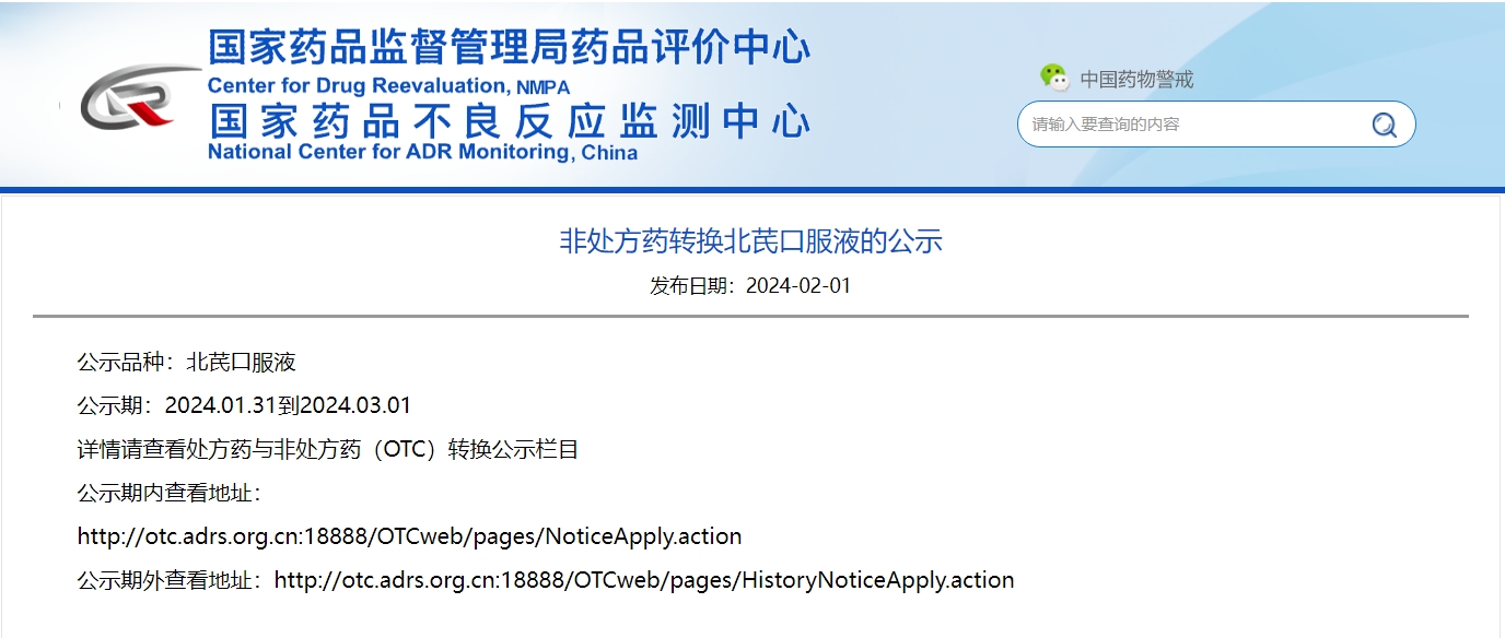 非處方藥轉換北芪口服液的公示