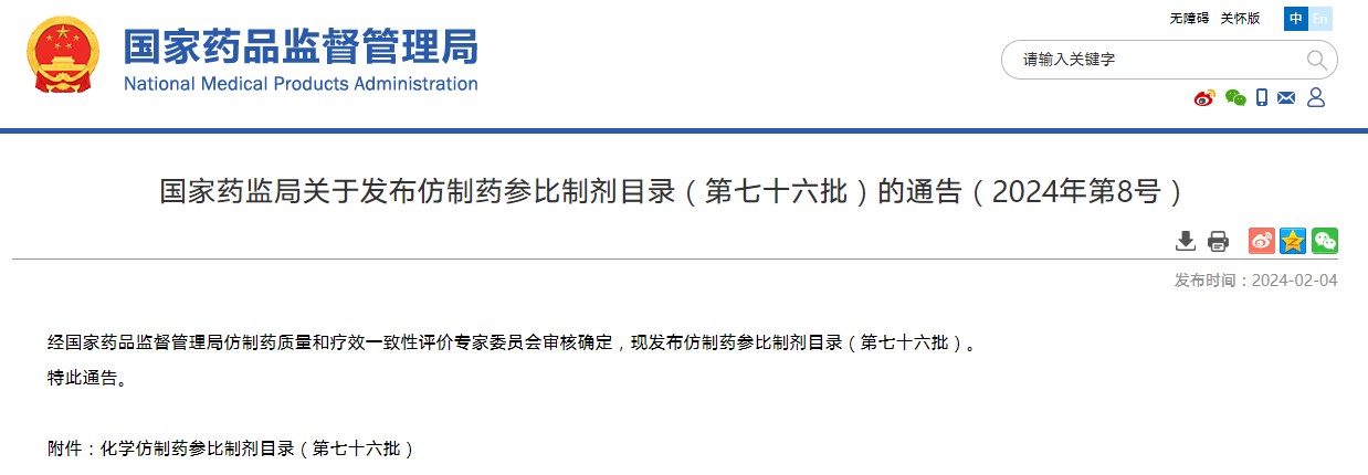 國家藥監局關于發布仿制藥參比制劑目錄(第七十六批)的通告(2024年第8號)