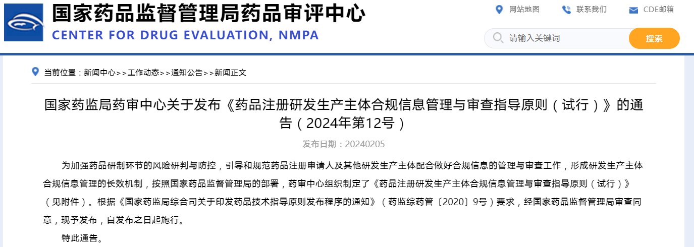 國家藥監局藥審中心關于發布《藥品注冊研發生產主體合規信息管理與審查指導原則(試行)》的通告(2024年第12號)